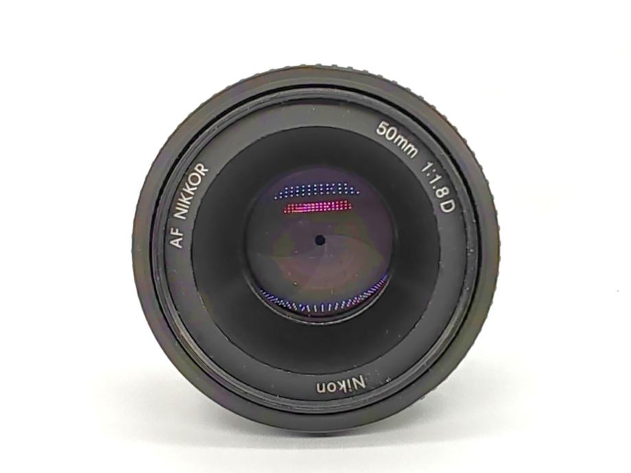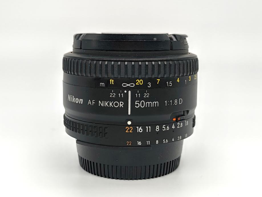 Objektiv Nikon AF Nikkor 50 mm f/1.8D s torbico (samo testiran, kot nov). Objektivi AF-D nimajo lastnega motorčka za ostrenje, zato samodejno ostrenje na vstopnih modelih D3xxx, D5xxx ne deluje.