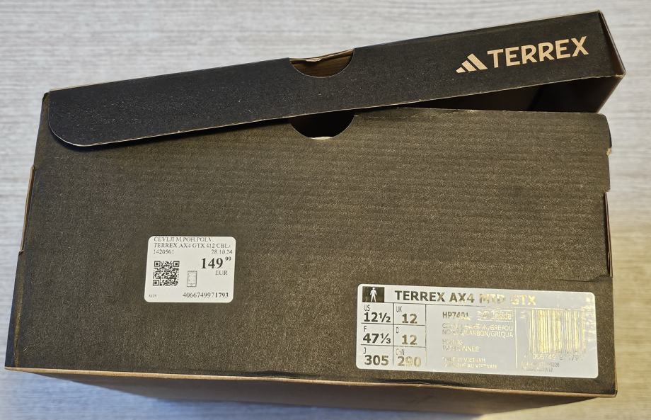 Prodam povsem nove (nikoli nošene) moške polvisoke pohodne čevlje Adidas TERREX AX4 MID GTX, številka 47 1/3 (29 centimetrov).