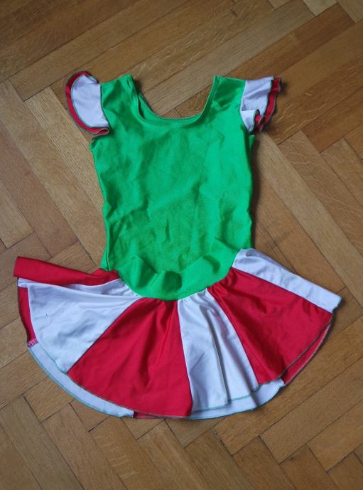 Zelo dobro ohranjen dres zelene barve z nabranima belima in rdečima rokavoma, zraven pride še rdeče-belo nabrano krilce - zanimiva barvna kombinacija, dobra kvaliteta.