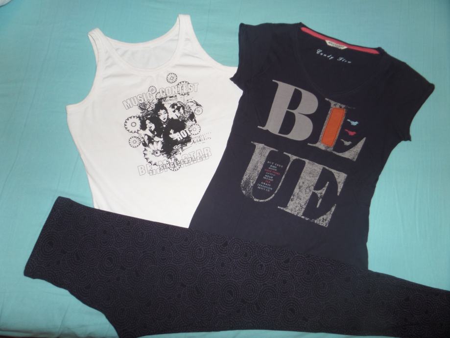 Prodam komplet: 1x majica brez rokavov, 1x majica z kratkim rokavom + črne legice, št. 170/176.