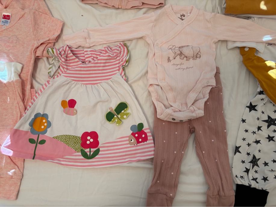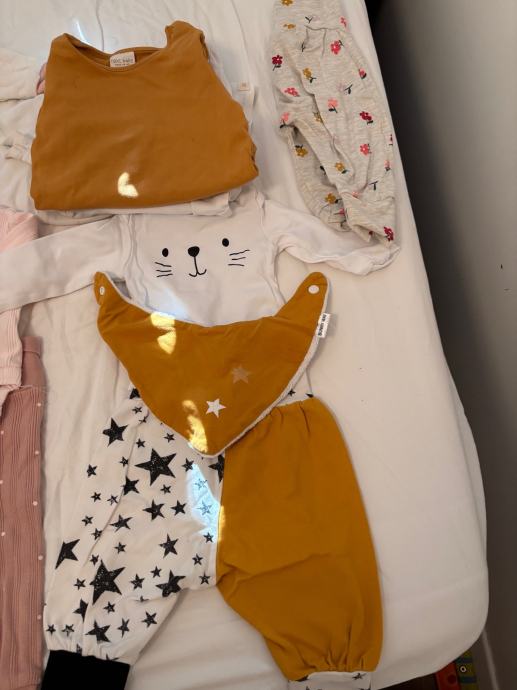 - bodi z muco, hlace in slincek z zvezdicami, hlace z rozicami Bunny way slo izdelava