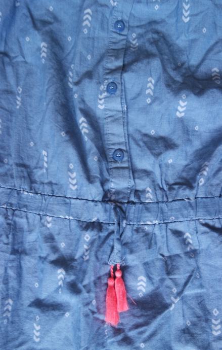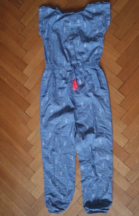 Super ohranjen pajac iz lahkega bombaža, svetlo modre barve z vzorci, v pasu rožnat trakec, zapenjanje spredaj z gumbi.