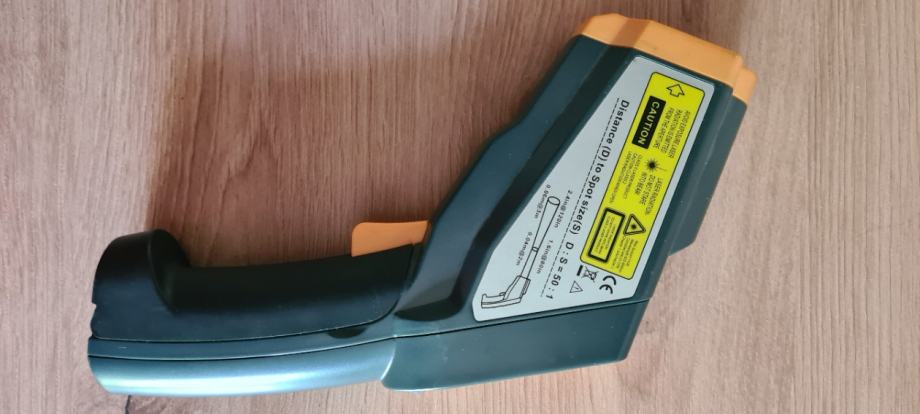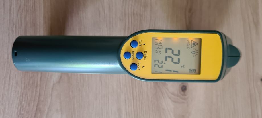 RayTemp 38 je profesionalni brezkontaktni infrardeči termometer v obliki pištole z dvojno lasersko poravnavo pik. Ta termometer je zasnovan za natančno merjenje temperature in ponuja optično razmerje 50:1, kar uporabnikom omogoča merjenje majhnih tarč z varne razdalje. Uporabniki lahko udobno stojijo na razdalji od tarče, usmerijo termometer na površino, ki jo merijo, potegnejo sprožilec in takoj odčitajo temperaturo. Popoln je za merjenje temperature na težko dostopnih predmetih, kar zagotavlja natančne in hitre meritve na različnih površinah.