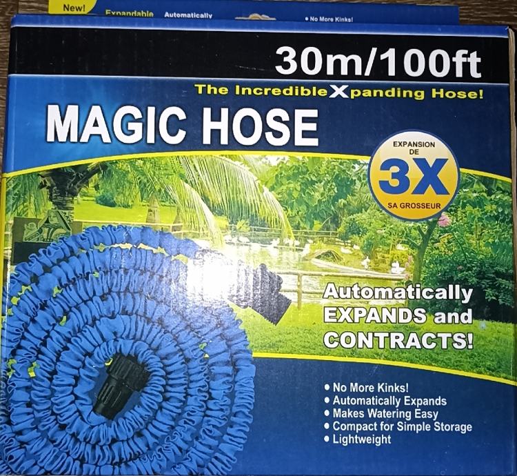 Raztegljiva vrtna cev Magic hose je cev, ki se raztegne na trikratno dolžino in avtomatično skrči nazaj na začetno velikost, ko je ne uporabljate več. Ima tehnologijo tesnjenja, ki zagotavlja popolnoma tesne spoje. Skrivnost je v izjemno močnem materialu priključkov. Priložena je tudi brizgalka s sedmimi različnimi načini zalivanja.