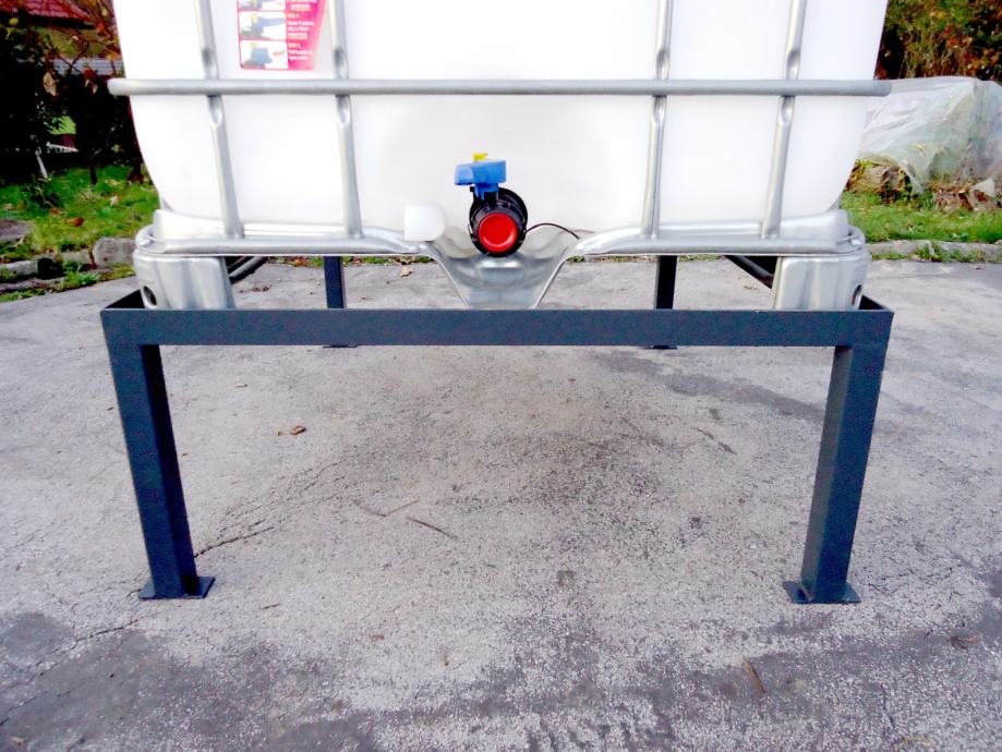 Podstavek je izdelan iz močnega kotnega in oglatega jekla zagotavlja stalno obremenitev min. 1500 kg, zaščiten s protikorozivno barvo, cisterna je stabilno nameščena znotraj robov stojala. IBC-komplet je še neuporabljen in je v stanju kot novo.