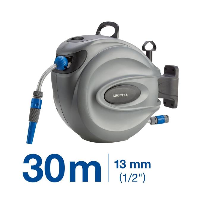 Stenska škatla z gibko cevjo LUX-TOOLS omogoča zalivanje majhnih in srednje velikih območij vašega vrta. Ker je vrtno gibko cev preprosto izvleči, vam to olajša njeno premikanje. Po uporabi je mogoče gibko cev tudi dobro shraniti. Maksimalna izvlečna dolžina gibke cevi je 30 m. Škatla z gibko cevjo je združljiva s priključki velikosti 13 mm (1/2").Škatla z gibko cevjo za prostorsko varčno stensko montažoKer je škatla z gibko cevjo namenjena za stensko montažo, lahko z njo preprečite spotikanje na prostem in poskrbite za red. Ohišje je izdelano iz umetne mase, odporne proti UV-žarkom in vremenskim vplivom. Po potrebi lahko škatlo z gibko cevjo kadarkoli preprosto snamete. Stenska škatla z gibko cevjo je opremljena s samodejnim navijalnim mehanizmom za hitro in preprosto navijanje cevi.