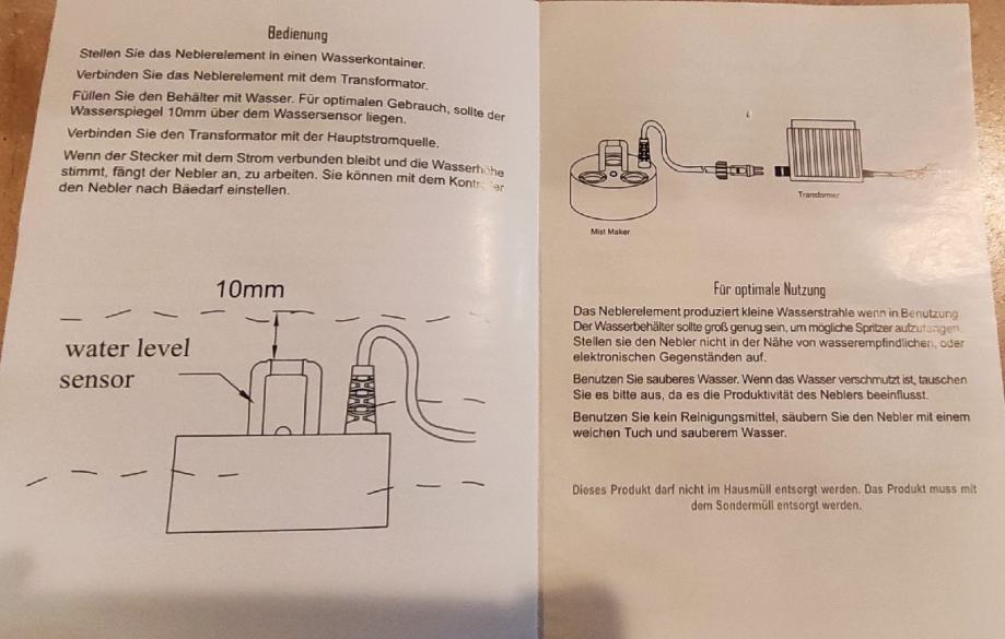 Primeren za srednje do večje prostore, rastlinjake, manjše okrasne ribnike, fontane, s svetlobnim učinkom, zanimiv tudi za umetniške scenske učinke. Kot nov, poskusno uporabljen enkrat. Kupljen v Nemčiji. Iz slik in videa navodil razvidno, kako deluje.
