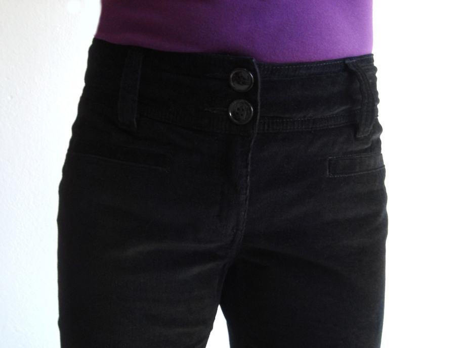 Model: srednje visok pas, široke hlačnice (na trapez). Spredaj in zadaj imajo po 2 žepa, ki sta še zašita in se lahko razparata.