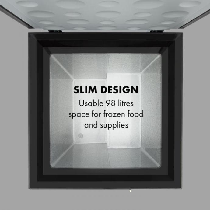 * prostorsko varčna: kompaktna zamrzovalna skrinja za kuhinje, kleti, skladišča ali garaže * prostorna notranjost: uporabna prostornina 98 litrov za globoko zamrznjena živila in zaloge * varčna: ekološki razred energetske učinkovitosti A+ * praktična: izvlečna notranja košara za večjo preglednost * enostavna: brezstopenjsko nastavljiva temperatura zamrzovalnika s signalnimi lučkami v razponu -15 in -26 °C * vsestranska: primerna za dolgoročno shranjevanje mesa, rib, zelenjave, sladoleda ali zamrznjenih živil * enostavno čiščenje: hladilni boks z izpustno odprtino na dnu za enostavno odtaljevanje * s ključavnico: pokrov s ključavnico za preprečitev neželenega dostopa