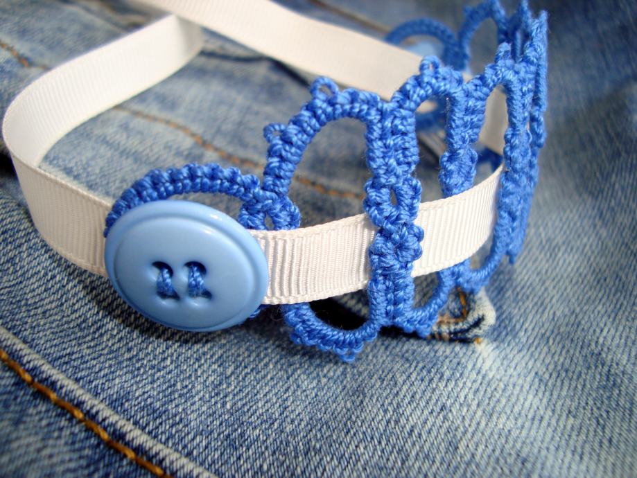 Modro-bela zapestnica iz vozlane čipke (needle tatting) iz 100% bombaža, ki se zaveže z belim trakom v pentljo. Na vsaki strani je okrasni gumb v nežno modri barvi.