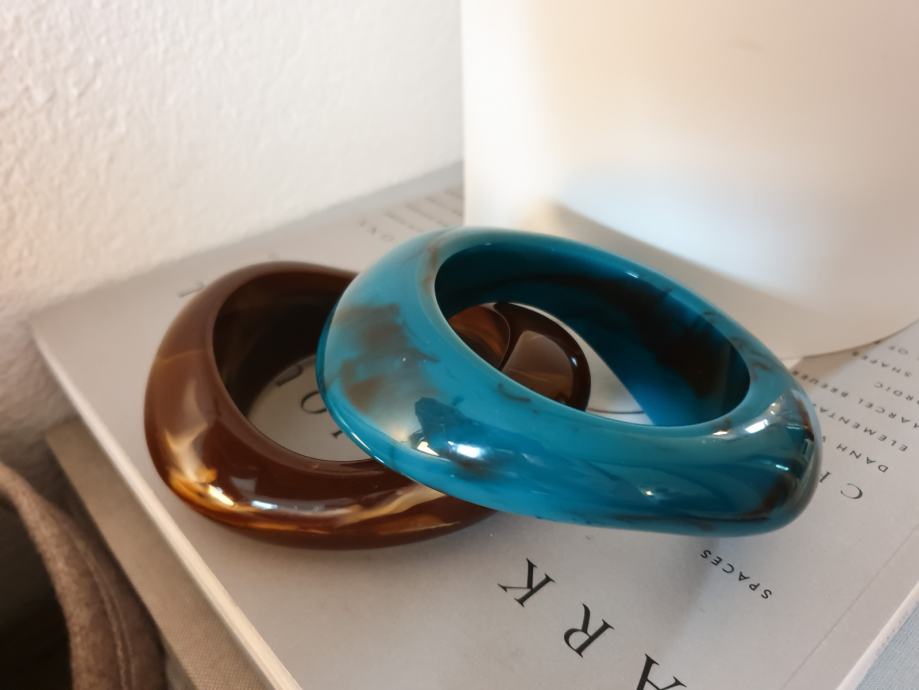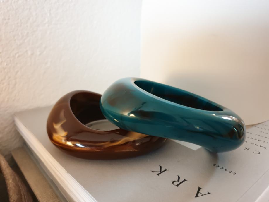 Prodam čudovit set masivnih zapestnic Max Mara, petrol zelene in rjave barve, iz umetne mase. Cena novih je bila 60 eur za komplet. Zapestnici sta kot novi, cena za komplet.