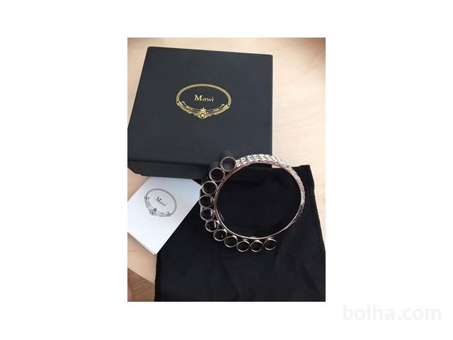Zapestnica je srebrne barve, polovica je obdana s swarovski kristalčki, druga polovica pa z majhnimi valji.