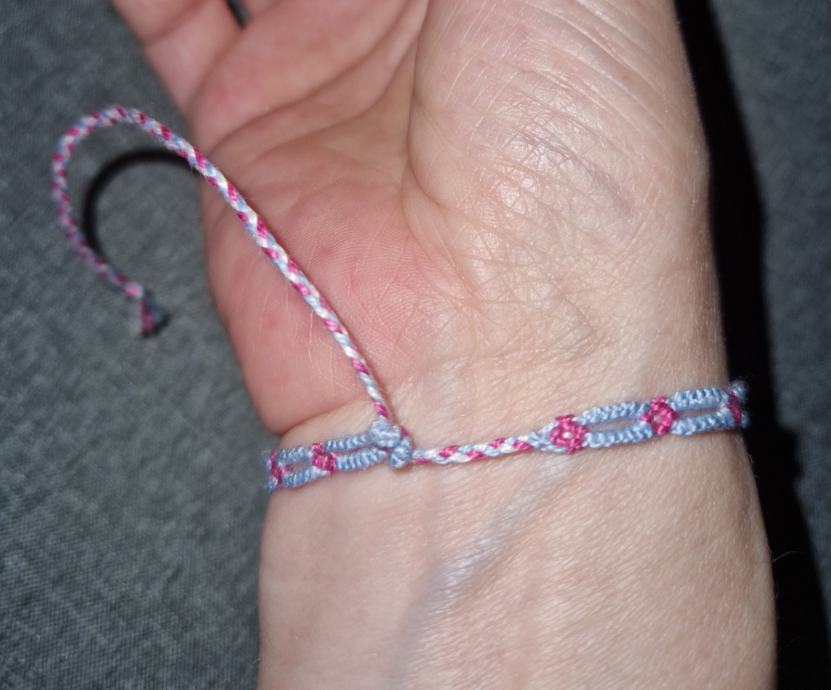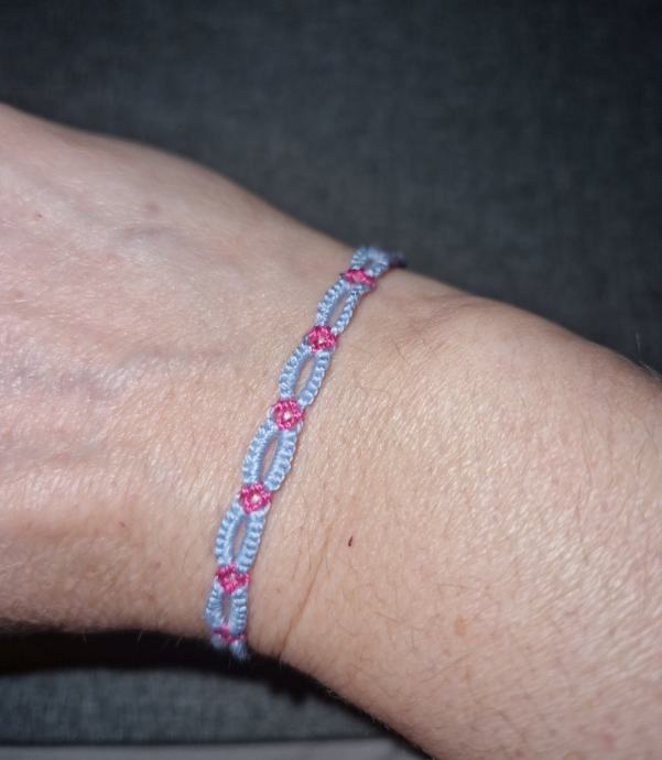 Ročno pletena zapestnica z nastavljivim obsegom > 20 cm.