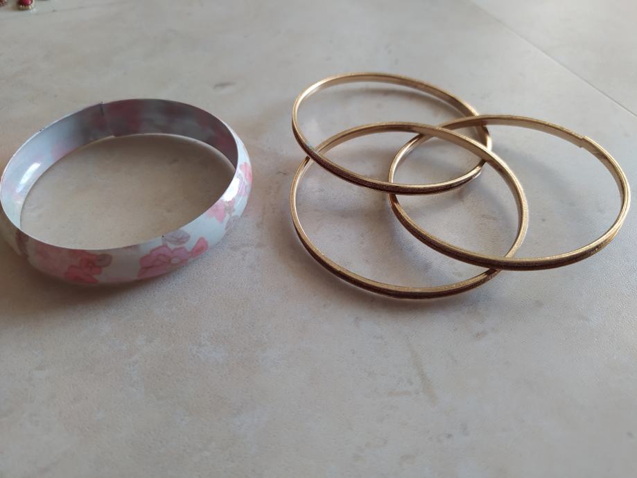 4. 3 obročki z zlatimi bleščicami. Širina enega obročka je 3 mm, premer 7 cm.