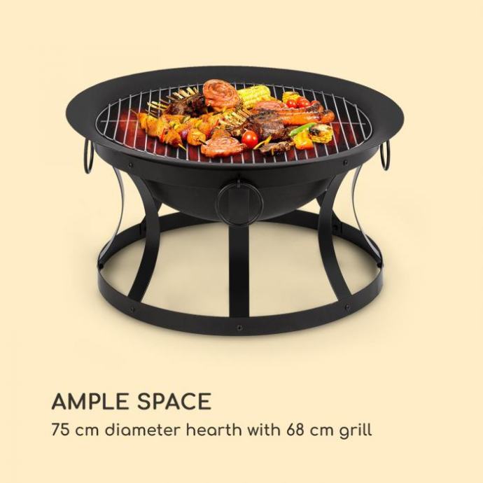* Dvojna praktičnost: posoda za ogenj iz litega železa z žar rešetko iz plemenitega jekla * Privlačna: eleganten, črn dizajn se zlije z vsakim ambientom * Dovolj prostora: posoda za ogenj s premerom 73 cm in žar rešetko v velikosti 60 cm * Posebno vzdušje: koncept FireView za prijetno vzdušje s prijetno toploto * Trpežna in stabilna: nerjavna podlaga iz praškasto lakiranega jekla * Zaščita pred iskrami: mreža proti naraščajoči vročini in letečim iskram * Vse je vključeno: vključeni ročaj, lovilec isker in žar rešetka