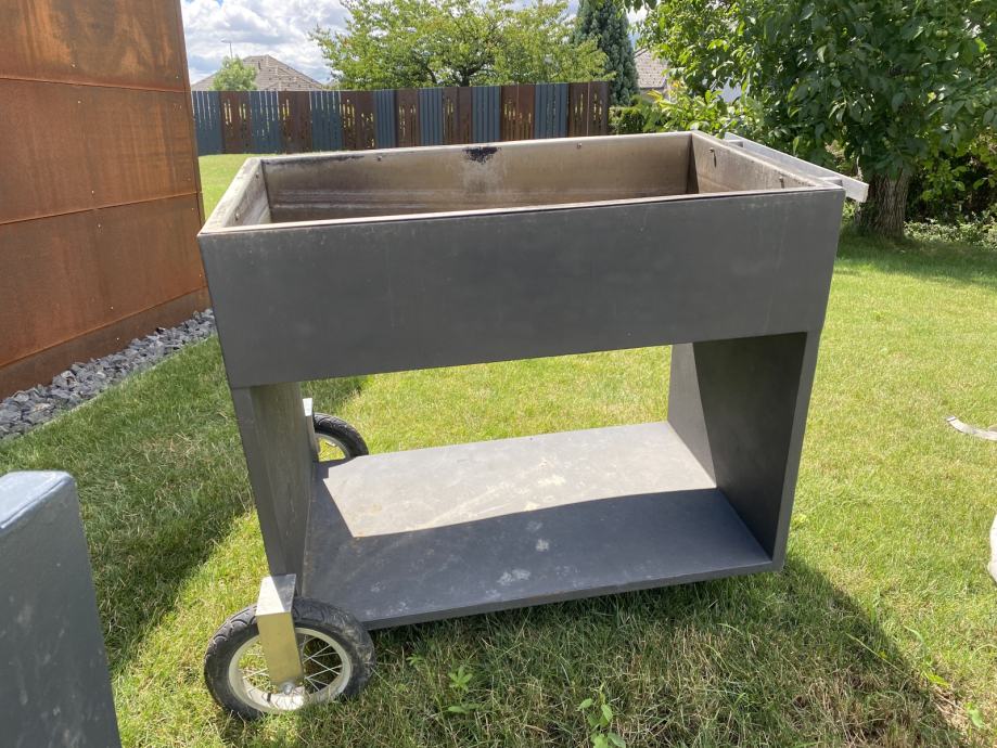 Žar je dimenzije 100x60 cm. Je premičen. K žaru pripadata dve rešetki, od katerih je ena polna plošča obe iz RF.