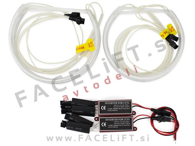 BMW CCFL Angel Eyes obročki za naknadno vgradnjo v žaromete. Set vsebuje štiri CCFL obročke, dva napajalnika, dvostranski lepilni trak in plastične sponke za pritrditev obročkov.