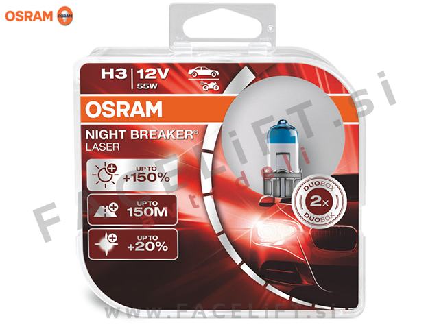 Halogenske žarnice Osram Night Breaker Laser H3 (PK22s) 55W 12V. Žarnice so nove, v kompletu prejmete par (2 kosa).