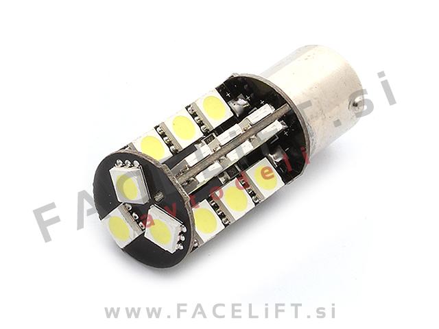 LED žarnica BA15S 1156, 27x SMD (5050) z vgrajenimi upori (CAN-BUS), ki preprečujejo napako na računalniku po zamenjavi halogenske žarnice z LED žarnico. Žarnica je nova, zapakirana, z garancijo. Cena je za en kos.
