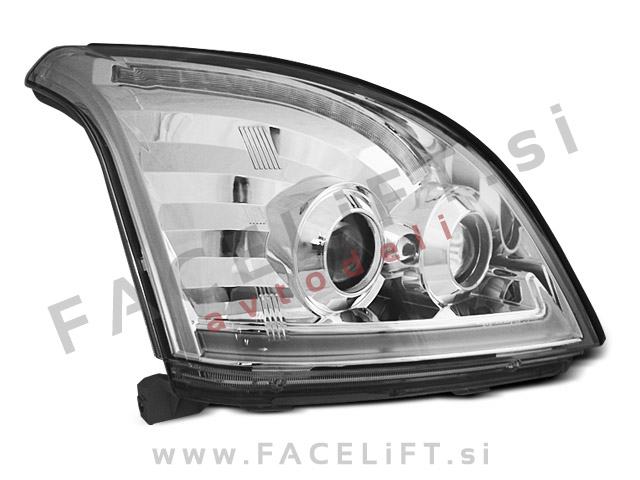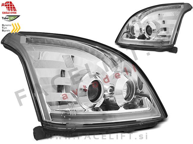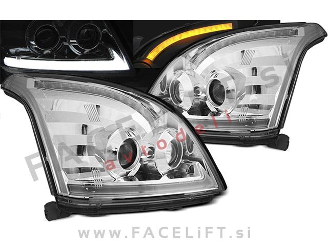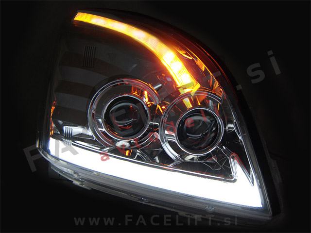 Halogenski žarometi z LED pozicijskimi lučmi, dinamičnim LED smernikom (DTS) in lečo za kratki in dolgi snop. Žarometi so novi, z garancijo. V kompletu prejmete par, levi in desni žaromet.