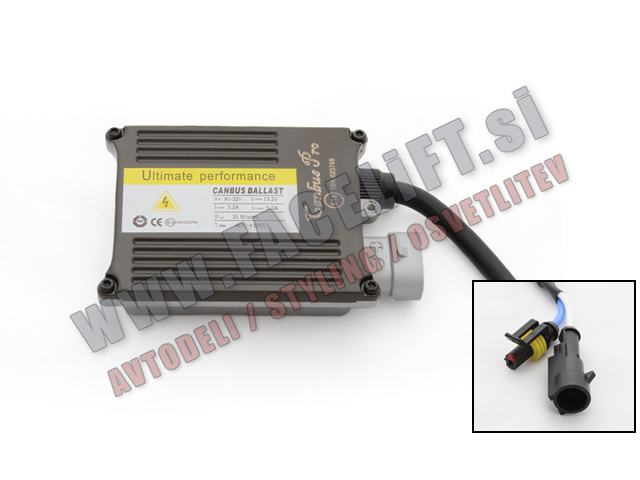 Profesionalni xenon kit komplet z vgrajenim CAN-BUS sistemom, ki preprečuje javljanje napake računalnika po vgradnji v novejša vozila in utripanje žarnic na starejših vozilih. Kit vsebuje dve kvalitetni diginalni kontrolni enoti, dve xenon žarnici, in vse potrebno za montažo. Za priklop ni potrebno obiskati servisa, montaža je enostavna - plug & play, samo priklopite na obstoječe priključke. Xenon kit je nov, zapakiran. Garancija na žarnice 3 mesce, na kontrolne enote - balaste 1 leto.