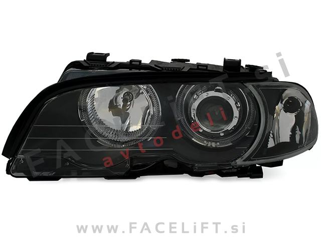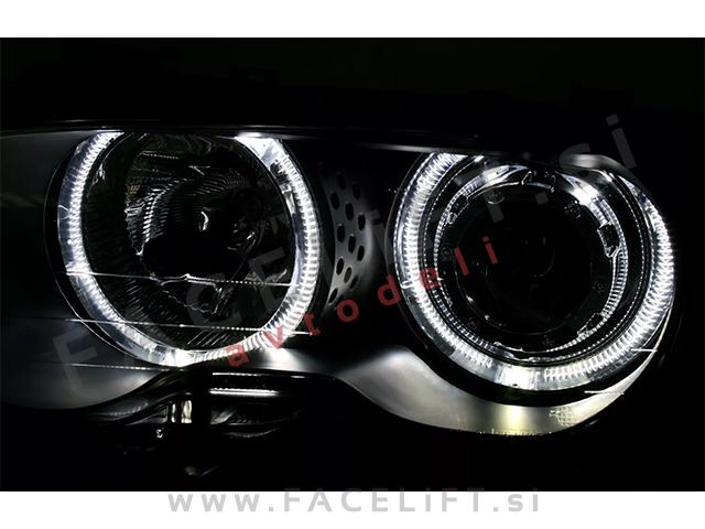 Halogenski žarometi z LED Angel Eyes pozicijskimi lučmi in lečo za kratki snop. Žarometi so novi, z garancijo. V kompletu prejmete levi in desni žaromet ter levi in desni smernik.