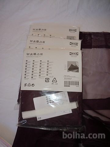 ZAVESE V BARVI MELANCANE, rahlo prosojne z nežnim leskom. 2 kompleta. En komplet vsebuje 2 zavesi dimenzije 145 š x 300 višine (vsaka). Kupljene v Ikei. So nove in jih prodajamo, ker smo spremenili idejo in zmontirali panelne zavese.Cena posameznega kompleta je 10€
