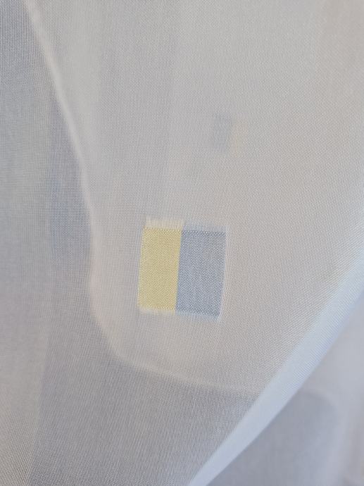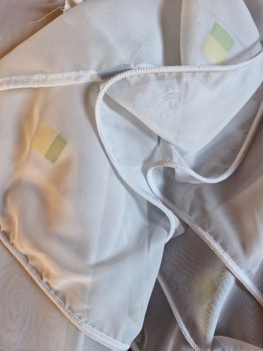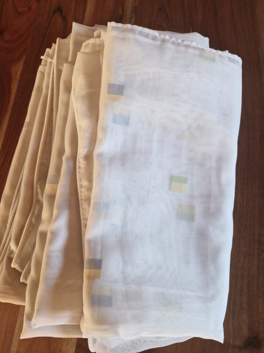 Bele barve, z malimi kvadratki, tanko in fino blago.