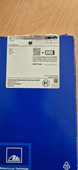 Zaradi napačnega nakupa prodam nove ATE ploščice za Golf 6 1.4 TSI 122HP imajo tudi senzor obrabe oziroma priključni kabel.