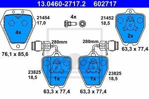 Prednje zavorne obloge 13.0460-2717.2 - Audi A6, A8, 100. Zavorne ploščice pretvorijo kinetično energijo s pomočjo trenja dveh ploščic in vrtečega diska. Ponašajo se z visoko kvaliteto in zmogljivostjo ter zagotavljajo optimalno ustvarjanje trenja in toplote, ki omogoči vozilu da se ustavi oziroma se njegova hitrost zmanjša. Lastnosti izdelka: Sirina 1 63,3 mm, Visina 1 77,4 mm, Debelina 1 18,5 mm, Sirina 2 76,1 mm, Visina 2 85,6 mm, Debelina 2 17 mm, vkl. opozorilni kontakt obrabe, Stev. Indikatorjev obrabe 2 p.osi, Dolzina opozorilnega kontakta 280 mm, Stevila oblog 8, s vijaki za sedlo kolutne zavore, stevila vijakov 4, Zavorni sistem Lucas / TRW, Kontrolna oznaka E9 90R-01230/1654.