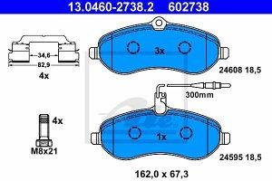Prednje zavorne obloge 13.0460-2738.2 - Citroen, Fiat, Peugeot. Lastnosti izdelka: Sirina 162,2 mm, Visina 66,8 mm, Debelina 18,3 mm, z integriranim senzorjem za obrabo, Stev. Indikatorjev obrabe 1 p.osi, s vijaki za sedlo kolutne zavore, s priborom, Zavorni sistem Lucas, st.izdelka priporocenega pribora 82073300. Cena velja za garnituro.