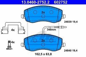 Prednje zavorne obloge 13.0460-2752.2 - Citroen, Fiat, Lancia, Peugeot. Zavorne ploščice pretvorijo kinetično energijo s pomočjo trenja dveh ploščic in vrtečega diska. Ponašajo se z visoko kvaliteto in zmogljivostjo ter zagotavljajo optimalno ustvarjanje trenja in toplote, ki omogoči vozilu da se ustavi oziroma se njegova hitrost zmanjša. Lastnosti izdelka: Sirina 162,5 mm, Visina 63,8 mm, Debelina 19,4 mm, vkl. opozorilni kontakt obrabe, Dolzina opozorilnega kontakta 348 mm, s priborom, s vijaki za sedlo kolutne zavore, stevila vijakov 4, Zavorni sistem Lucas / TRW, Kontrolna oznaka E1 90R-011240/1243.