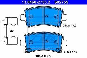 Prednje zavorne obloge 13.0460-2755.2 - Opel, Saab. Lastnosti izdelka: Sirina 106,4 mm, Visina 47,1 mm, Debelina 17,3 mm, z opozorilnim zvokom obrabe, Stev. Indikatorjev obrabe 4 p.osi, s priborom, Zavorni sistem TRW, st.izdelka priporocenega pribora 82503900. Cena velja za garnituro.