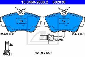 Prednje zavorne obloge 13.0460-2838.2 - VW Transporter 90-03. Zavorne ploščice pretvorijo kinetično energijo s pomočjo trenja dveh ploščic in vrtečega diska. Ponašajo se z visoko kvaliteto in zmogljivostjo ter zagotavljajo optimalno ustvarjanje trenja in toplote, ki omogoči vozilu da se ustavi oziroma se njegova hitrost zmanjša. Lastnosti izdelka: Sirina 129,9 mm, Visina 65,2 mm, Debelina 19,2 mm, vkl. opozorilni kontakt obrabe, Dolzina opozorilnega kontakta 195 mm, s vijaki za sedlo kolutne zavore, stevila vijakov 2, Zavorni sistem Lucas / TRW.