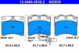 Prednje zavorne obloge 13.0460-2839.2 - Volkswagen Transporter 90-03. Zavorne ploščice pretvorijo kinetično energijo s pomočjo trenja dveh ploščic in vrtečega diska. Ponašajo se z visoko kvaliteto in zmogljivostjo ter zagotavljajo optimalno ustvarjanje trenja in toplote, ki omogoči vozilu da se ustavi oziroma se njegova hitrost zmanjša. Lastnosti izdelka: Sirina 1 91,5 mm, Visina 1 80 mm, Debelina 1 18,3 mm, Sirina 2 91,7 mm, Visina 2 81,5 mm, Debelina 2 18,7 mm, vkl. opozorilni kontakt obrabe, Stev. Indikatorjev obrabe 1 p.osi, Zavorni sistem Lucas / TRW, Kontrolna oznaka E1 90R-01040/415. Cena velja za garnituro.