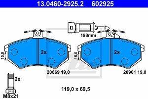 Prednje zavorne obloge 13.0460-2925.2 - Audi 80, 100, 200. Dolzina 119 mm, Visina 69,6 mm, Debelina 19,6 mm, Kvaliteta 300, Teza 1.486 kg, Izvedba osi Front, Tehnicna informacijska stevilka 180836-700, Zavorni sistem Lucas - Girling, Kontrolna oznaka E9 90R-01111/039, vkl. opozorilni kontakt obrabe.