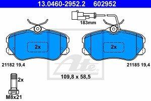 Prednje zavorne obloge 13.0460-2952.2 - Fiat, Lancia. Zavorne ploščice pretvorijo kinetično energijo s pomočjo trenja dveh ploščic in vrtečega diska. Ponašajo se z visoko kvaliteto in zmogljivostjo ter zagotavljajo optimalno ustvarjanje trenja in toplote, ki omogoči vozilu da se ustavi oziroma se njegova hitrost zmanjša. Lastnosti izdelka: Sirina 109,8 mm, Visina 58,5 mm, Debelina 19,4 mm, vkl. opozorilni kontakt obrabe, Dolzina opozorilnega kontakta 183 mm, s vijaki za sedlo kolutne zavore, stevila vijakov 2, Zavorni sistem Lucas / TRW. Cena velja za garnituro.