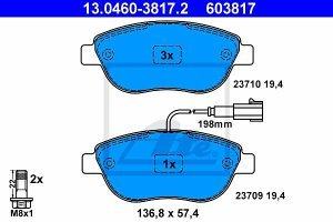 Prednje zavorne obloge 13.0460-3817.2 - Citroen, Fiat, Lancia. Sirina 137 mm, Visina 57,4 mm, Debelina 19 mm, z integriranim senzorjem za obrabo, Stev. Indikatorjev obrabe 1 p.osi, s vijaki za sedlo kolutne zavore, s priborom, Zavorni sistem Bosch. Cena velja za garnituro.