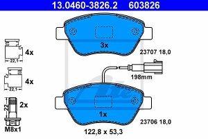 Prednje zavorne obloge 13.0460-3826.2 - Alfa, Fiat, Lancia. Sirina 122,8 mm, Visina 53,3 mm, Debelina 17,8 mm, z integriranim senzorjem za obrabo, Stev. Indikatorjev obrabe 1 p.osi, s vijaki za sedlo kolutne zavore, s priborom, Zavorni sistem Bosch. Cena velja za garnituro.