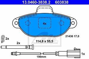 Prednje zavorne obloge 13.0460-3838.2 - Fiat, Ford. Sirina 114,8 mm, Visina 55,2 mm, Debelina 17 mm, vkl. opozorilni kontakt obrabe, Stev. Indikatorjev obrabe 2 p.osi, Dolzina opozorilnega kontakta 200 mm, Zavorni sistem Bendix. Cena velja za garnituro.