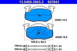 Prednje zavorne obloge 13.0460-3943.2 - Citroen, Peugeot. Sirina 105 mm, Visina 54,3 mm, Debelina 18 mm, pripravljen za opozorilnik obrabe, Zavorni sistem Bendix. Cena velja za garnituro.