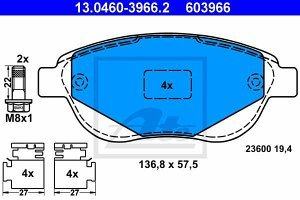 Prednje zavorne obloge 13.0460-3966.2 - Citroen C3. Letnik: 05-. Lastnosti: Sirina 136,8 mm, Visina 57,5 mm, Debelina 19,4 mm, ni predpripravljen za opozorilnik obrabe, brez opozorilnega kontakta obrabe, s priborom, s vijaki za sedlo kolutne zavore, stevila vijakov 2, Zavorni sistem Bosch, Kontrolna oznaka E1 90R-01484/400, MAPP-Code na razpolago