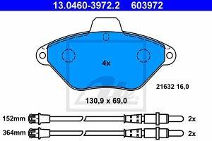 Prednje zavorne obloge 13.0460-3972.2 - Citroen Xantia. Dolzina 131 mm, Visina 69,1 mm, Debelina 16 mm, Kvaliteta 300, Teza 1.480 kg, Izvedba osi Front, Tehnicna informacijska stevilka 180921, Zavorni sistem Bendix, Kontrolna oznaka KBA 60714, vkl. opozorilni kontakt obrabe.
