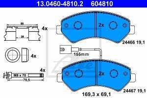 Prednje zavorne obloge 13.0460-4810.2 - Citroen, Fiat, Peugeot. Sirina 169,1 mm, Visina 69,1 mm, Debelina 19 mm, z integriranim senzorjem za obrabo, Stev. Indikatorjev obrabe 1 p.osi, Zavorni sistem Brembo, st.izdelka priporocenega pribora 82075800. Cena velja za komplet (2 kosa).