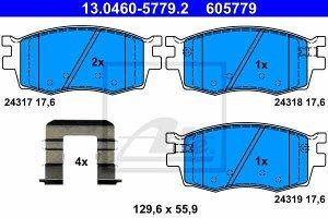 Prednje zavorne obloge 13.0460-5779.2 - Hyundai, Kia. Lastnosti izdelka: Sirina 129,8 mm, Visina 56 mm, Debelina 17,5 mm, z opozorilnim zvokom obrabe, Zavorni sistem Mando, st.izdelka priporocenega pribora 82508500. Cena velja za garnituro.