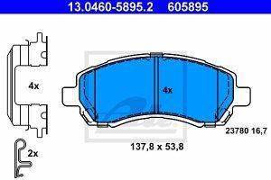 Prednje zavorne obloge 13.0460-5895.2 - Subaru Impreza, Legacy. Lastnosti izdelka: Dolzina 137,75 mm, Visina 53,8 mm, Debelina 18 mm, Kvaliteta 300, Teza 1.510 kg, Izvedba osi Front, Tehnicna informacijska stevilka 181318, Zavorni sistem Akebono, Kontrolna oznaka E9 90R-01111/584, vkl. opozorilni kontakt obrabe.
