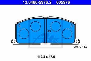 Prednje zavorne obloge 13.0460-5976.2 - Toyota. Lastnosti izdelka: Dolzina 119,8 mm, Visina 47,6 mm, Debelina 15 mm, Kvaliteta 300, Teza 1.020 kg, Izvedba osi Front, Tehnicna informacijska stevilka 180462, Zavorni sistem Akebono, Kontrolna oznaka E9 90R-01111/057, vkl. opozorilni kontakt obrabe.