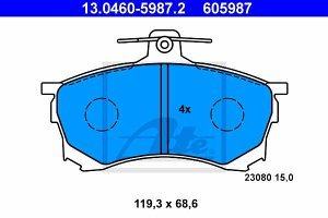 Prednje zavorne obloge 13.0460-5987.2 - Mitsubishi Carisma 95-06. Lastnosti izdelka: Dolzina 119,2 mm, Visina 68,47 mm, Debelina 15,8 mm, Kvaliteta 300, Teza 1.260 kg, Izvedba osi Front, Tehnicna informacijska stevilka 181117-700, Zavorni sistem Lucas - Girling, Kontrolna oznaka E9 90R-01111/096, vkl. opozorilni kontakt obrabe.