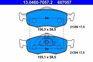 Prednje zavorne obloge 13.0460-7057.2 - Ford Mondeo. Zavorne ploščice pretvorijo kinetično energijo s pomočjo trenja dveh ploščic in vrtečega diska. Ponašajo se z visoko kvaliteto in zmogljivostjo ter zagotavljajo optimalno ustvarjanje trenja in toplote, ki omogoči vozilu da se ustavi oziroma se njegova hitrost zmanjša. Lastnosti izdelka: Sirina 1 156,3 mm, Sirina 2 155,1 mm, Visina 58,5 mm, Debelina 17,5 mm, ni predpripravljen za opozorilnik obrabe, brez opozorilnega kontakta obrabe, Zavorni sistem ATE, Kontrolna oznaka E1 90R-01302/112.