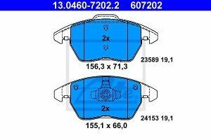 Prednje zavorne obloge 13.0460-7202.2 - Citroen, Peugeot. Lastnosti izdelka: Sirina 1 156,5 mm, Sirina 2 155,3 mm, Visina 1 71,3 mm, Visina 2 66 mm, Debelina 19 mm, brez opozorilnega kontakta obrabe, Zavorni sistem Teves, st.izdelka priporocenega pribora 82076800. Cena velja za garnituro.